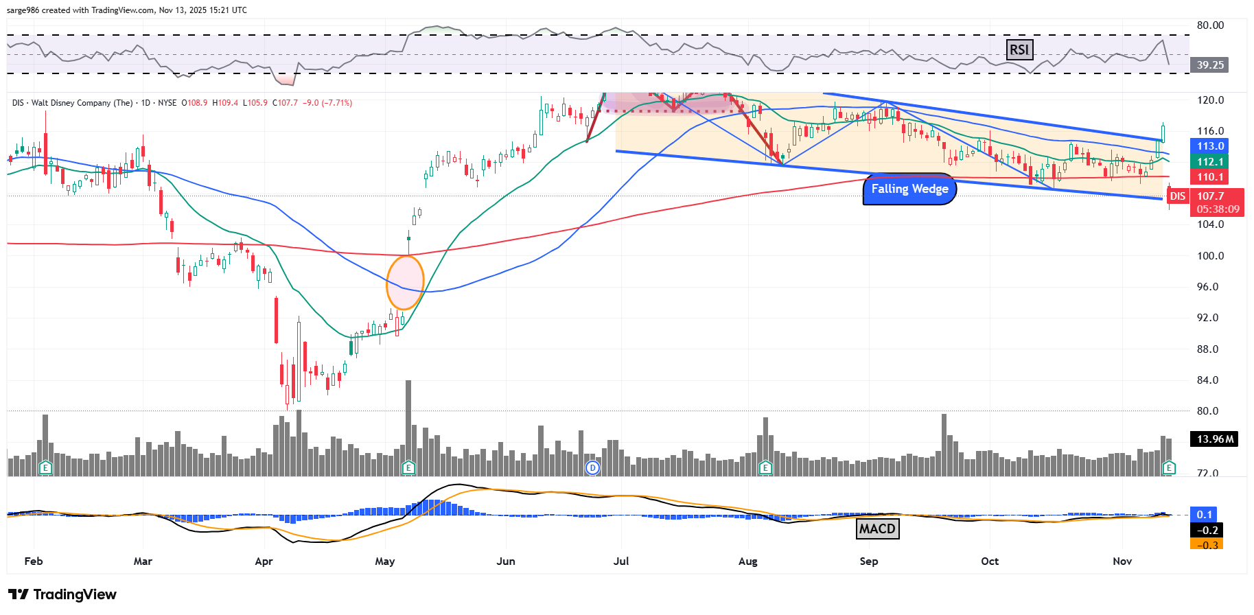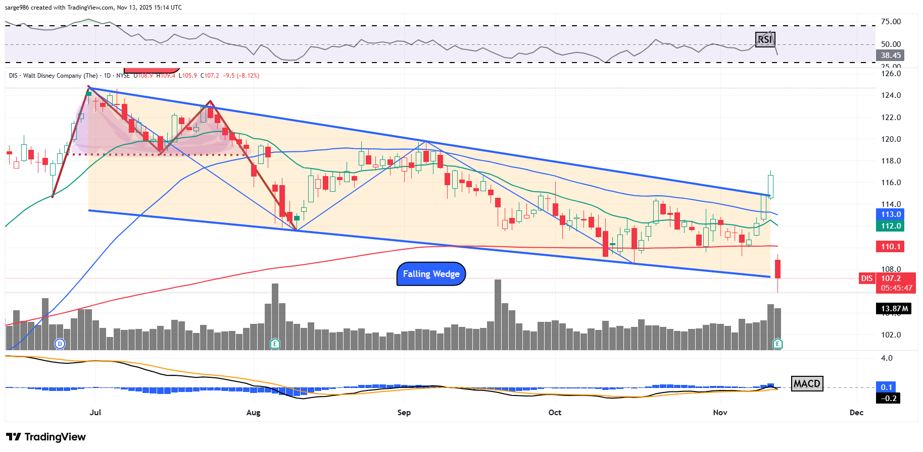 Take a look at this. DIS came off of a double-top pattern of bearish reversal in July and proceeded to develop a falling wedge of bullish reversal as the shares sold off over a five-month period. It almost worked. On Wednesday, ahead of earnings DIS tested the upper trendline of that wedge. Thursday morning? The stock has surrendered its 50-day SMA (losing some portfolio managers), its 21-day EMA (losing the swing crowd) and its 200-day SMA (losing seriously die-hard portfolio managers).